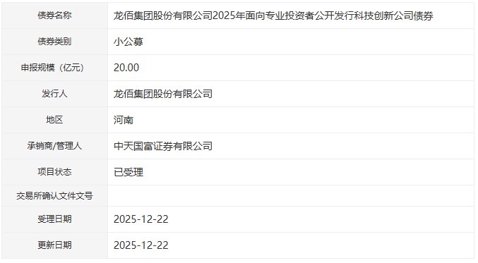 【大河财立方音问】12月22日,龙佰集团股份有限公司2025年面向专科投资者公竖立行科技立异公司债券表情获深交所受理。本期债券讲述范围20亿元,期限不逾越5年(含5年),品种为小公募,承销商/解决东说念主为中天堂富证券。